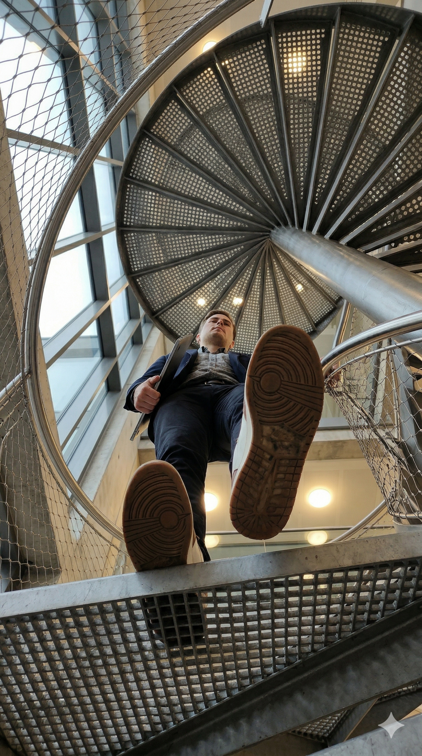 Prompt: Extreme low-angle worm’s-eye view shot, looking directly up from underneath a modern industrial spiral staircase. The camera is positioned at ground level, looking straight up at the soles of a marketeer’s shoes as he descends. The marketeer is carrying a closed, silver-aluminum laptop under his arm. He is wearing a dark navy blazer, a patterned shirt, and stylish leather sneakers with visible tread patterns on the soles. The staircase treads are made of industrial perforated metal grating, allowing the warm overhead ceiling lights to filter through the holes. The composition is vertical (9:16), capturing the full spiral geometry of the stairs. Shot on a smartphone, realistic everyday photo quality, natural lighting from ceiling fixtures, f/1.8 aperture with a slight motion blur on the stepping foot to emphasize movement, sharp focus on the metallic textures and the soles of the shoes.
