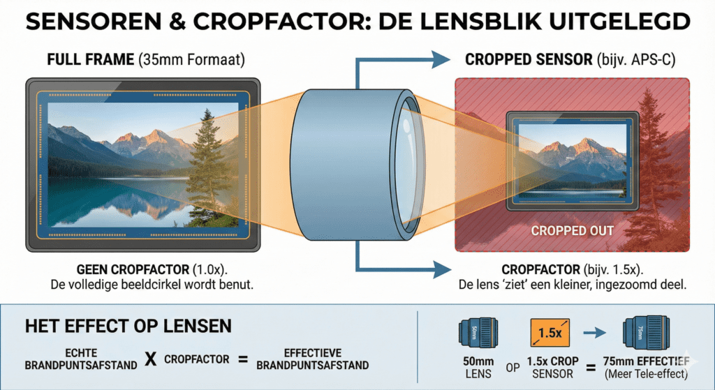 Vorige week stond ik naast een collega-fotograaf op een persmoment. Hij had een Micro Four Thirds camera met een 25mm lens. “Dat is toch veel te kort voor portretten?” vroeg ik. Hij grijnsde. “Dit is een 50mm equivalent door de cropfactor.” Op dat moment realiseerde ik me hoeveel verwarring dit onderwerp nog steeds veroorzaakt. De cropfactor bepaalt namelijk hoe je lens zich gedraagt op verschillende camerasystemen. En dat heeft directe gevolgen voor je beelduitsnede, je lenzenpark en je portemonnee.