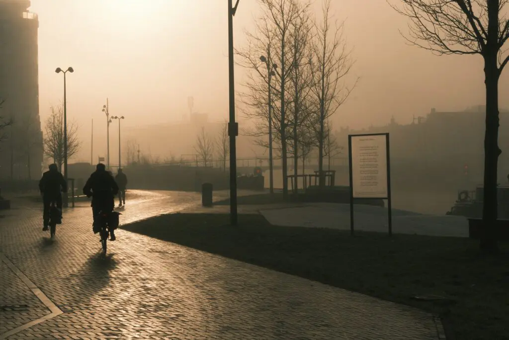 - Leidende lijnen: Wegen, paden of rivierbeddingen die verdwijnen in de mist versterken de sfeer.