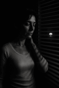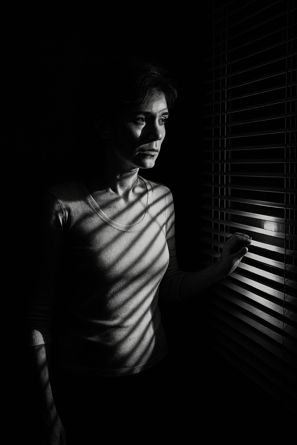 Same model as before. Now the woman stands in front of a window with blinds in her apartment. It's night. lamppost light shines through the blinds onto her face. The room is dark. 35mm camera lens, f/5.6 focus on blinds