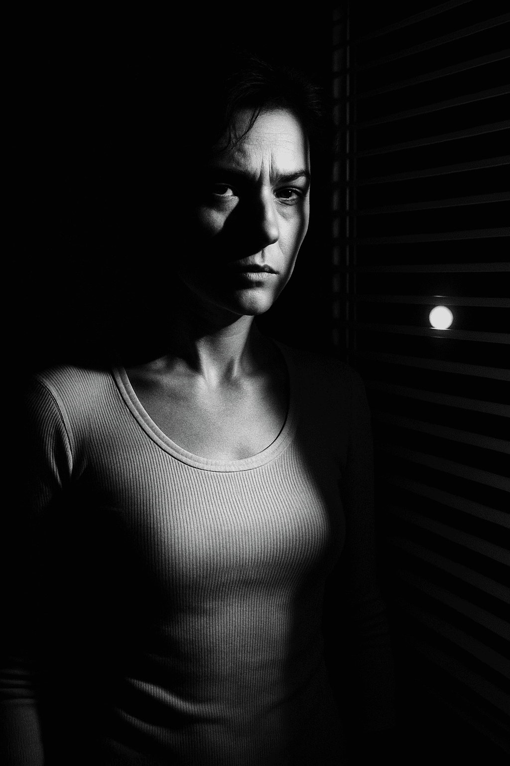 Same model as before. Add more contrast and bright white spotlight on 50% of face, like a classic Film Noir aesthetic. Little more light from the window, dim light in the back. Hands down. f/8 diafragma.